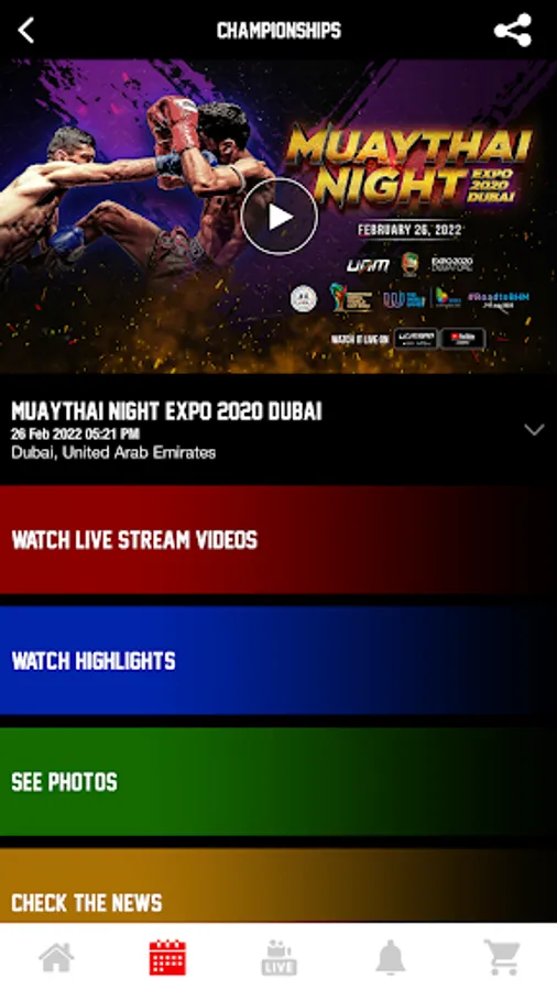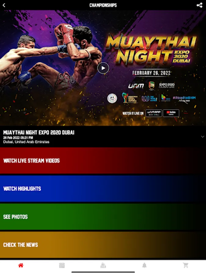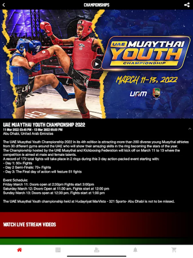 - Browse fight cards, past events and explore the schedule of the upcoming events and ticket sales to watch your favorite UAE Muay Thai bouts.