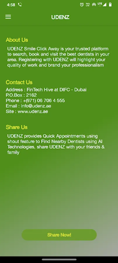 Users can search for Dentist by Distance , Type of Dental Service, Dental Specialty , Gender of Dentist , Country , City. Users can book Dental Appointments , check all Dental Offers , Submit their Smiles , Rate and share their Dental Experience. All only via the Menu and Map options on UDENZ App.