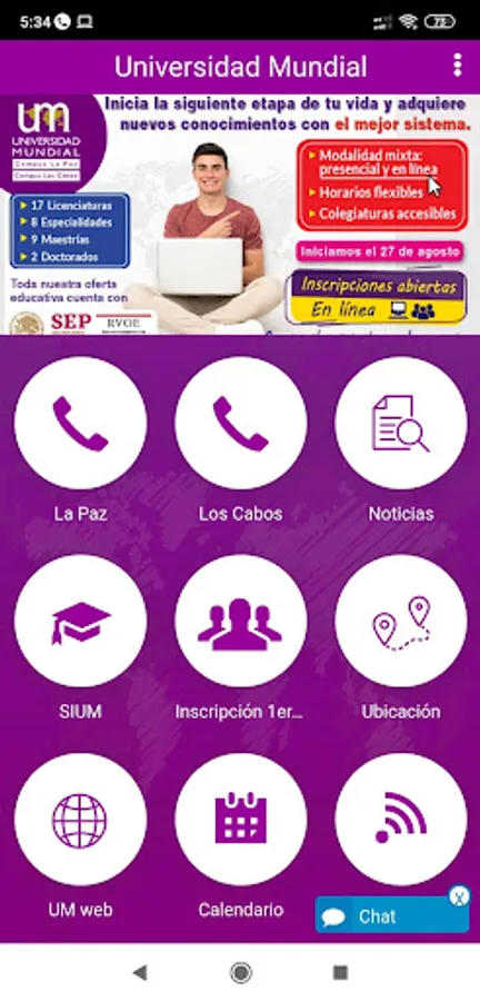 Application for the entire community, with the interest of knowing the most relevant news within the World University, as well as academic offers of the different degrees and promotions of the administrative area that are applicable and allow them to be part of the World University. Also, if you are already UM and you are with us, you will have access to SIUM where you can consult each of the academic and administrative services, which are part of the academic life of our students.
