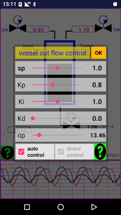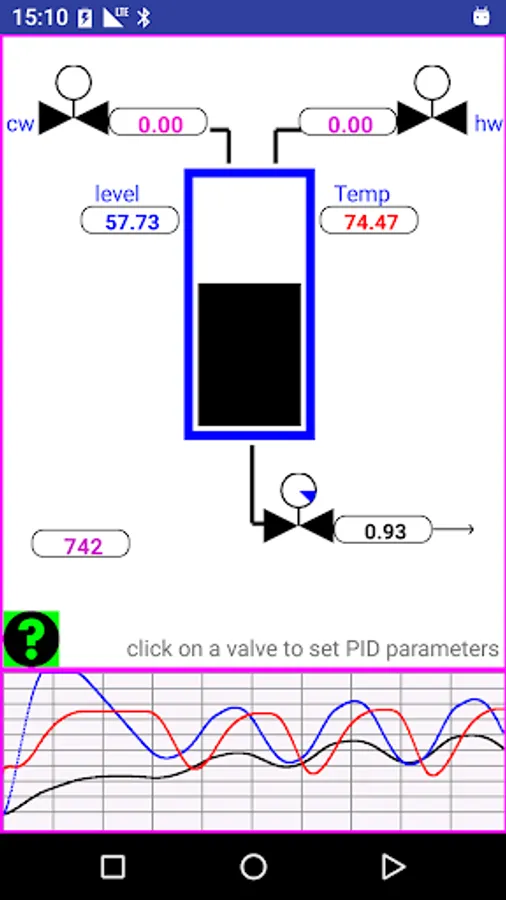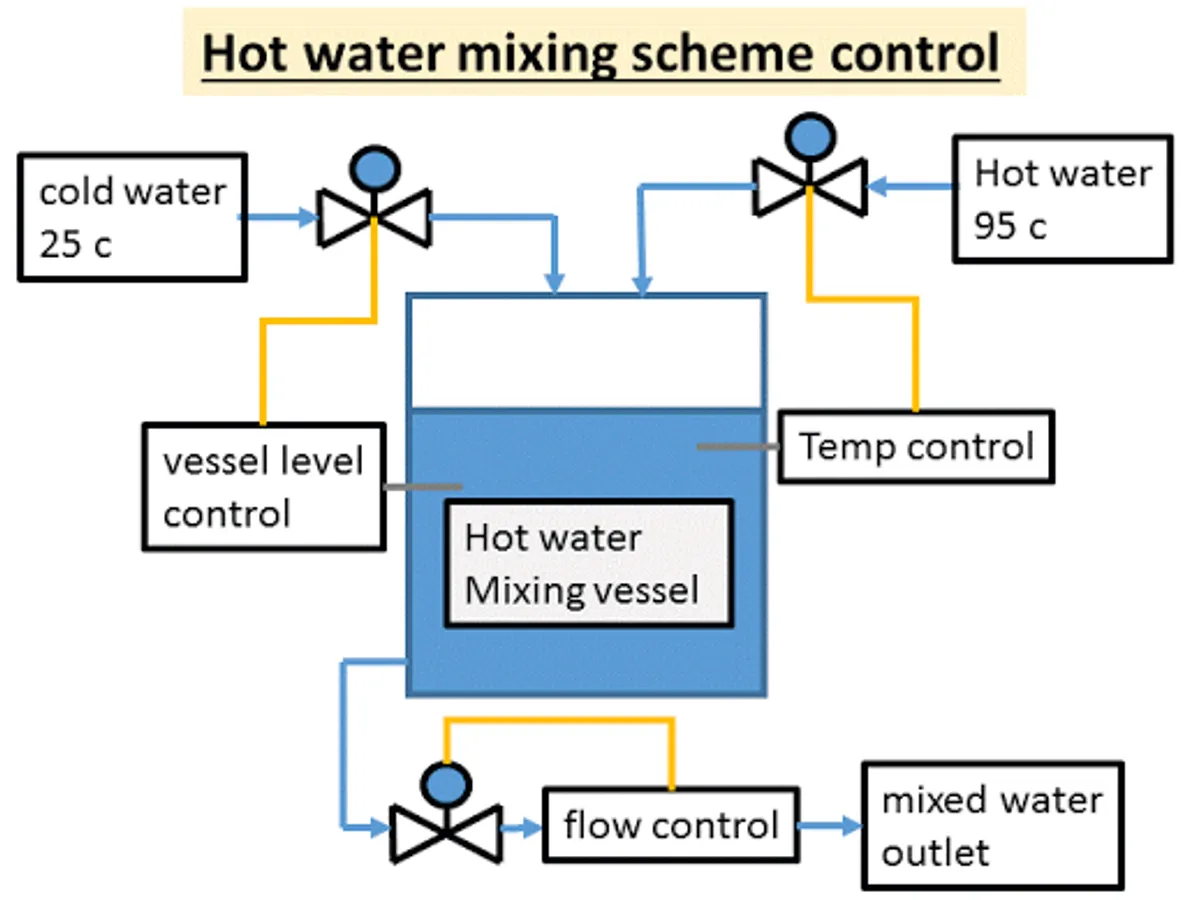 Simulation of hot and cold water vessel mixer, it contains 3 P.I.D control valves which controls :