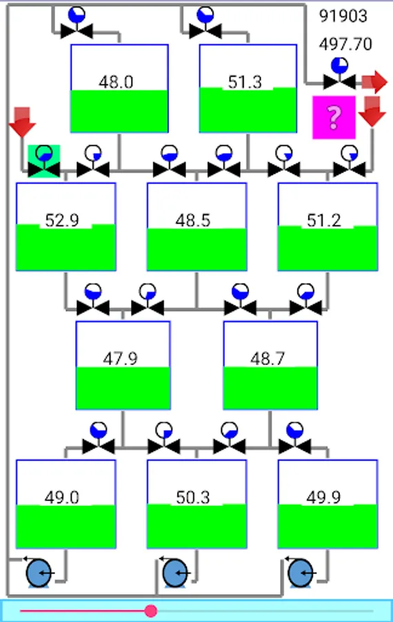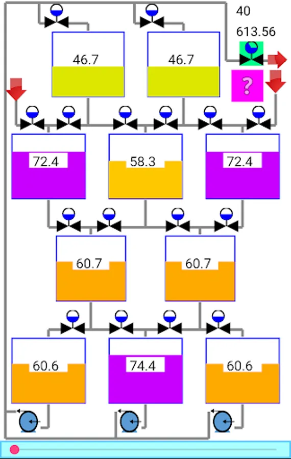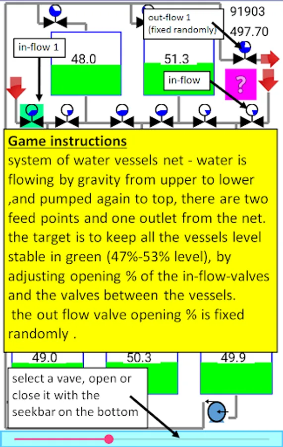 the target is to keep all the vessels level stable in green (47%-53% level), by adjusting opening % of the in-flow-valves and the valves between the vessels.