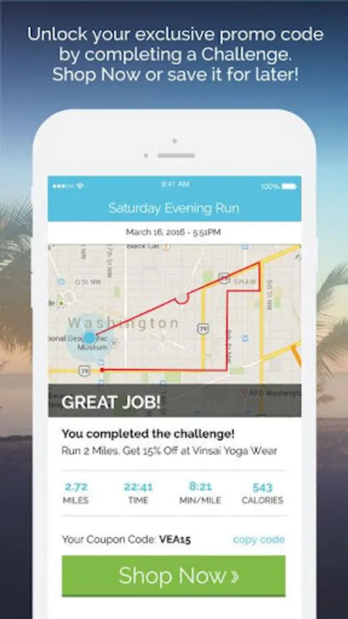 Vea has a feed of fitness challenges, like “Run 3 Miles, Get 15% off new running shoes”. When you’re ready to run or bike, select a Challenge, tap “Go Running” and Vea tracks your distance using GPS, time, speed and calories, as well as tells you how much further you need to run to earn that reward. Once you complete the Challenge, you can stop and you’ll see your summary. A coupon code is displayed, and the “Shop Now” button takes you right to that company’s website to use your new discount code.