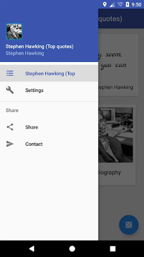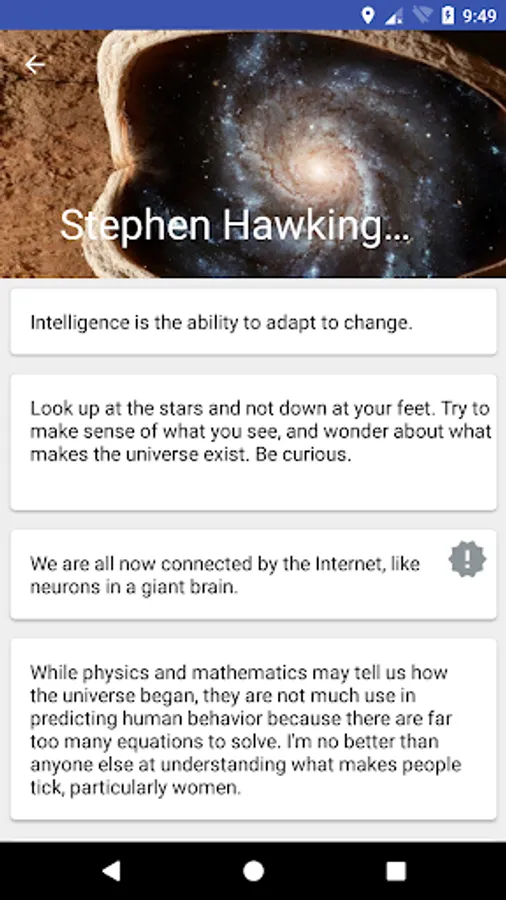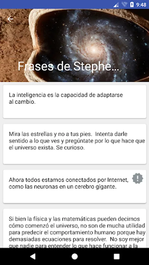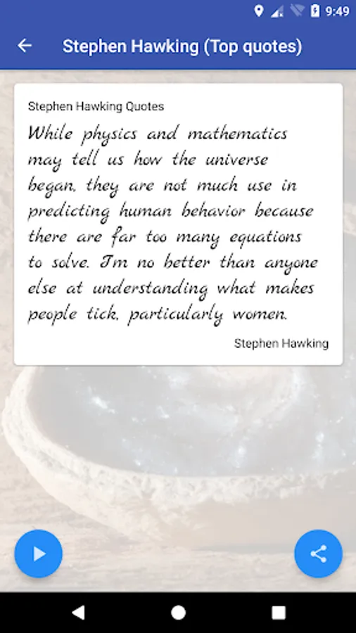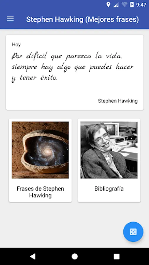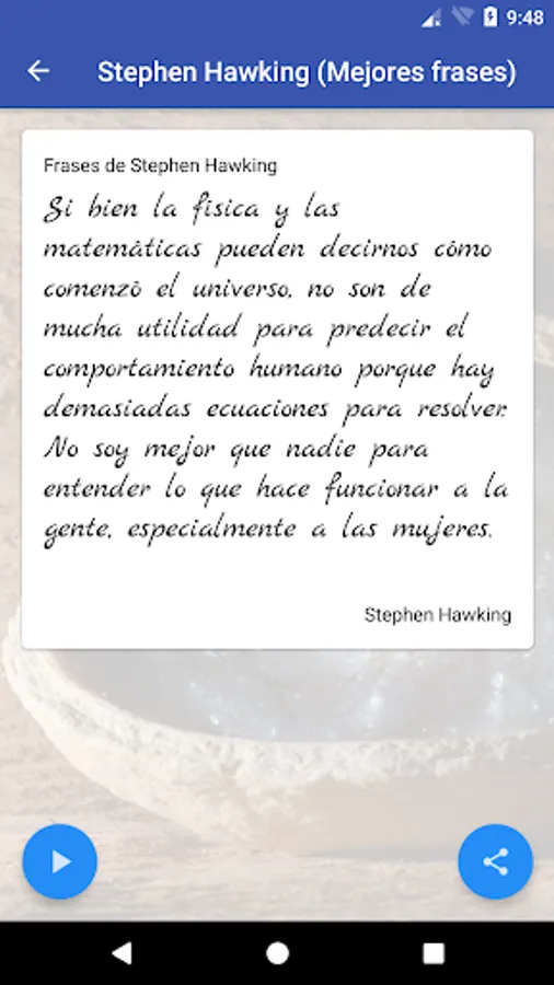 With Stephen Hawking top quotes you can read and listen bests quotes from scientist. Daily you will receive a new phrase and you can share the phrase in you social networks or messaging apps.