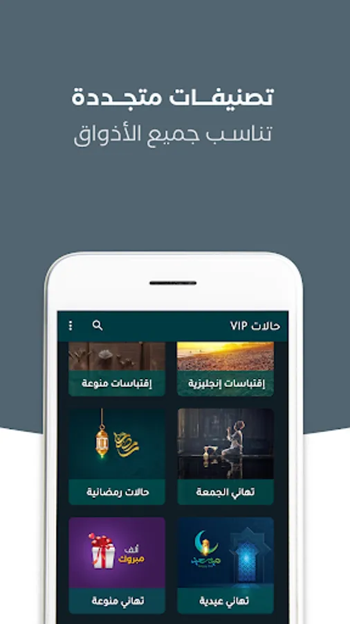 1- (Classifications): Here the VIP statuses application ratings are displayed, which reach 17 distinct and exclusive ratings that make the application top the list of the best WhatsApp cases applications, and these categories include: (screen wallpapers, various wallpapers, luxurious wallpapers, beautiful wallpapers, the most beautiful pictures, Beautiful WhatsApp pictures, good morning pictures, rose pictures, nature pictures, religious pictures, Friday pictures, sad pictures, love pictures, VIP cases, sad phrases, good morning cases, evening messages, religious WhatsApp cases, family cases, mother phrases , phrases about the father, talk about the brother, cases for WhatsApp, beautiful phrases, friendship cases, marital messages, love cases, romantic WhatsApp cases, various cases, sad WhatsApp cases, quotes in English, book quotes, Twitter quotes, phrases about optimism and ambition, cases WhatsApp love, romantic pictures, Ramadan greetings, Eid greetings, Eid al-Fitr congratulations, Eid al-Adha congratulations, blessed Friday, birthday cases, graduation cases, engagement cases, marriage congratulations, love letters, romantic cases, sad cases).