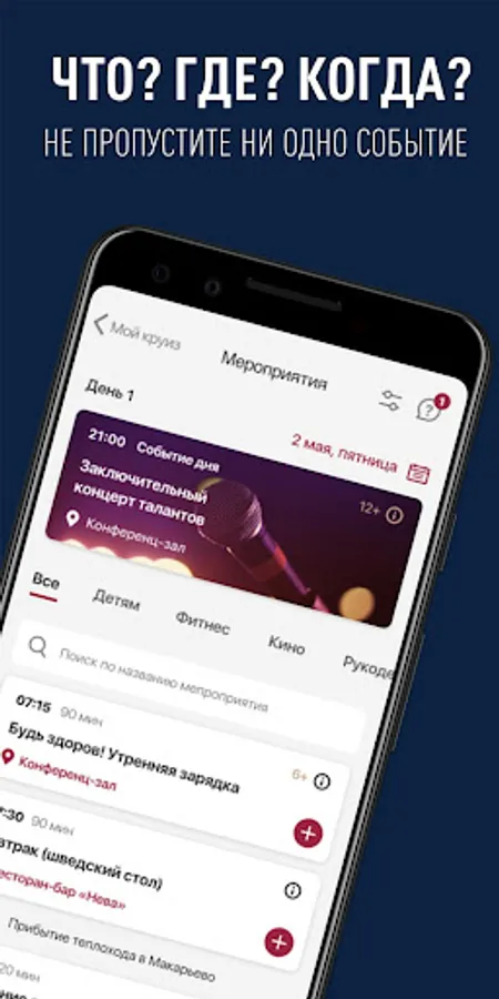 We know how important it is for you to have all the details of your trip at hand. Here you will find the program of the day with a program of activities: excursions, stops, restaurant schedules, main events on the boat. You can add events that you plan to attend to your personal calendar.