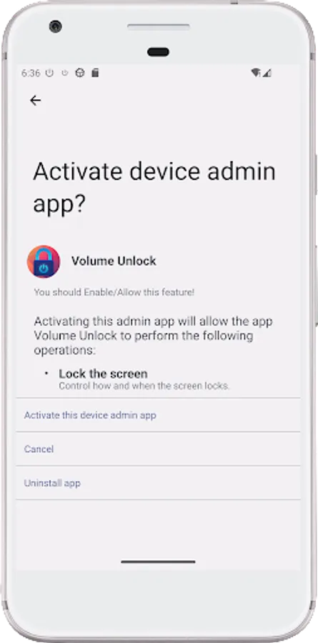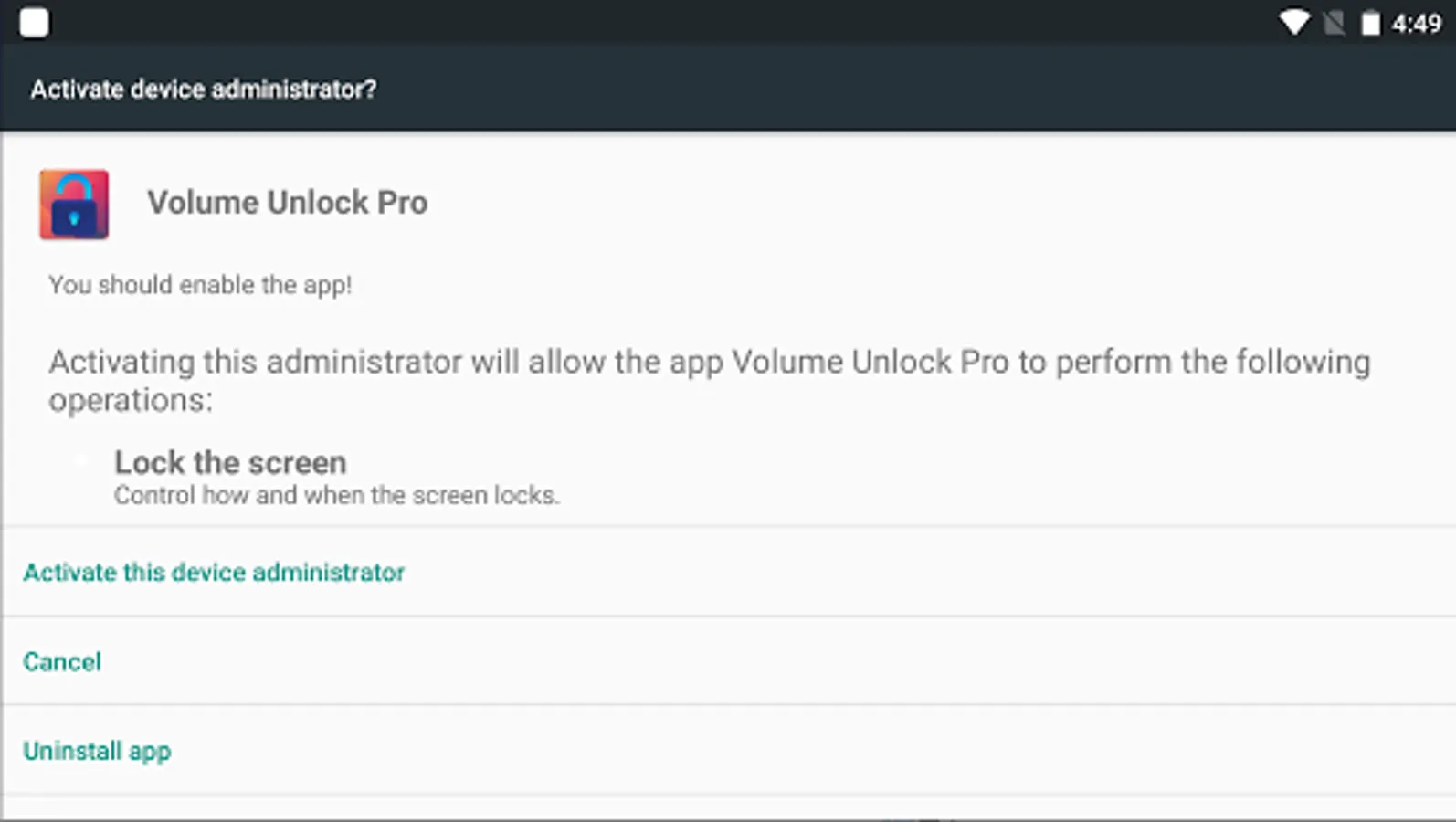 Volume Unlock Uses Device Administrator Permission to lock the device, once device admin permission is given user can not uninstall the Application normally, please use the uninstall option provided or go to Device administration settings and uncheck the Volume unlock to uninstall the application normally.