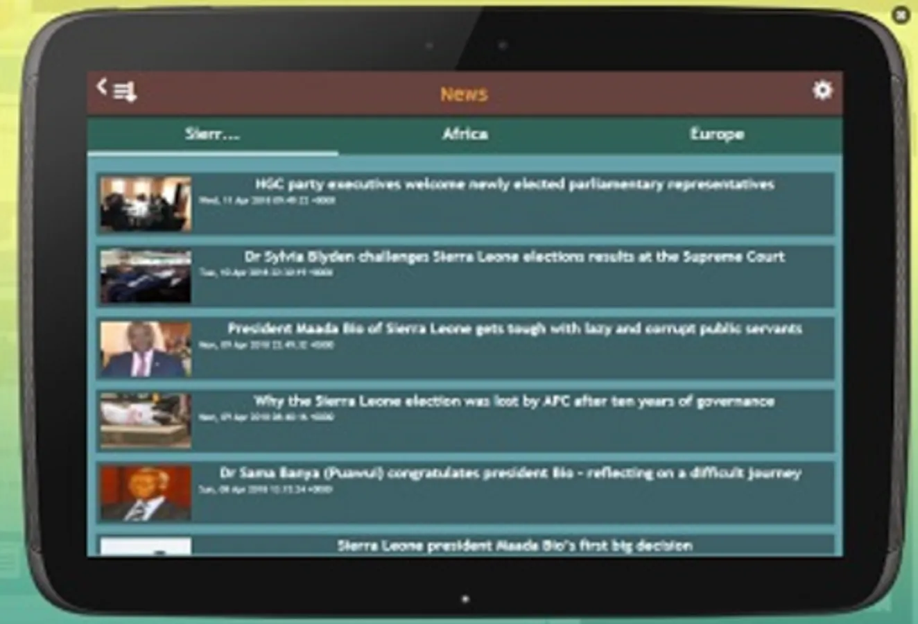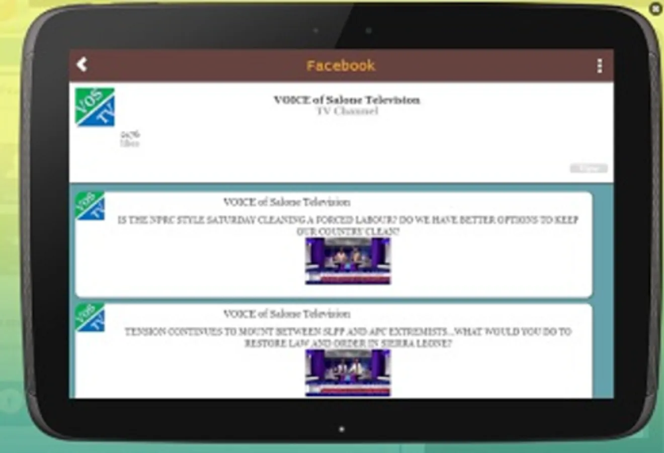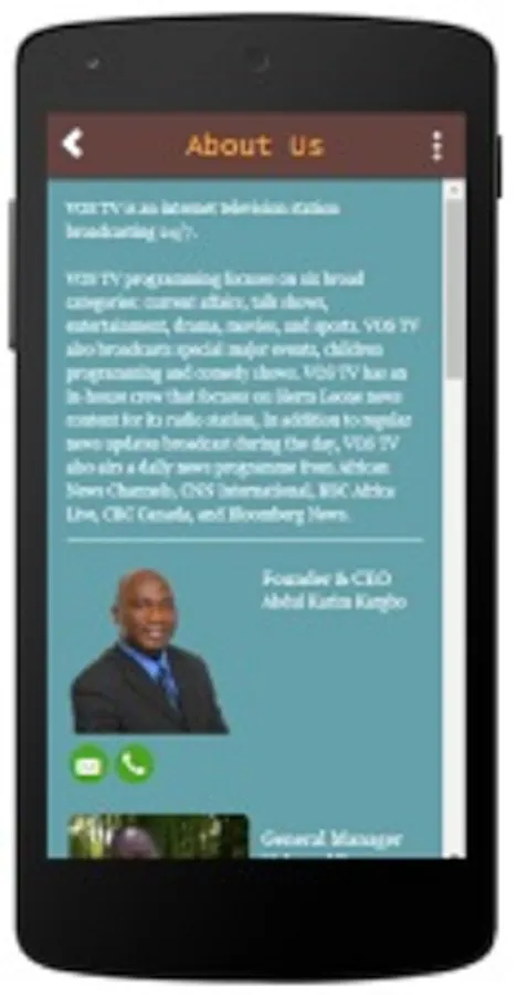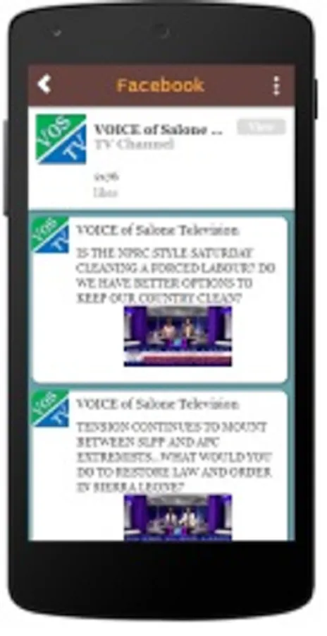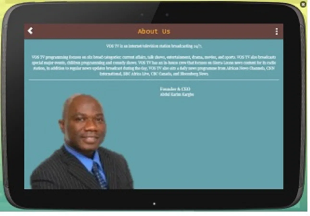 Voice of Salone TV is an internet television station broadcasting 24/7. Voice of Salone TV programming focuses on six broad categories: current affairs, talk shows, entertainment, drama, movies, and sports. VOS TV also broadcasts special major events, children programming and comedy shows. VOS TV has an in-house crew that focuses on Sierra Leone news content for its radio station. VOS TV shows top European league matches on weekends. In addition to regular news updates broadcast during the day, VOS TV also airs a daily news programme from African News Channels, CNN International, BBC Africa Live, CBC Canada, and Bloomberg News.