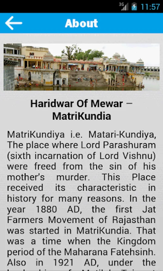 Matri Kundiya is the place where Lord Parashuram (sixth incarnation of Lord Vishnu) were freed from the sin of his mother’s murder. This application allows user to select English or Hindi.