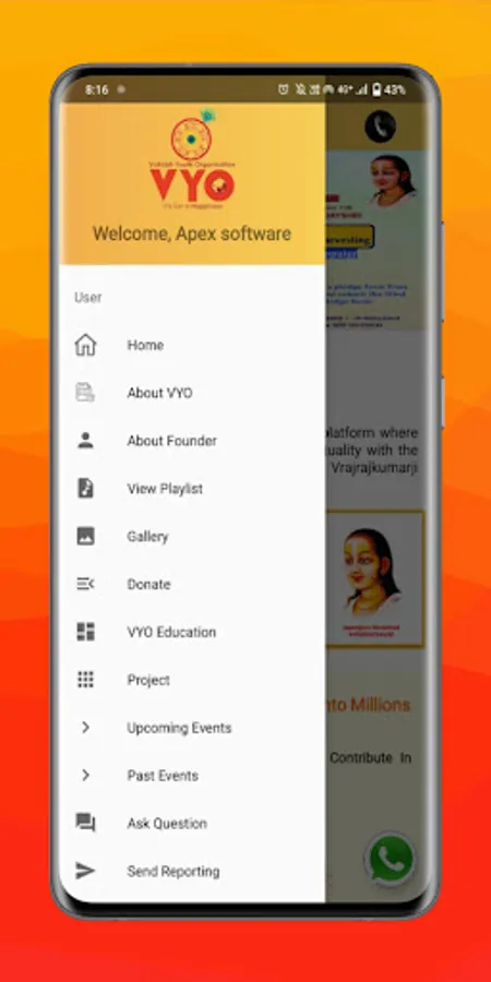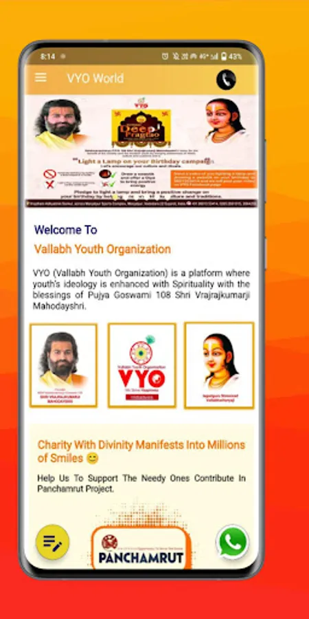 The VYO World Mobile application is inspired by the Pujya Pad Goswami Shri Vrajrajkumarji Mahoday Shri to bring you valuable teachings of Pushtimarg. This free application is built to connect you to Shri Krishna and the teaching of Shri Mahaprabhuji. This first version of this application provides a unique feature that provide user to send reporting , Ask Question to Pujya Vrajrajkumarji Mahoday and It allows you to stay updated with upcoming events by VYO too.
