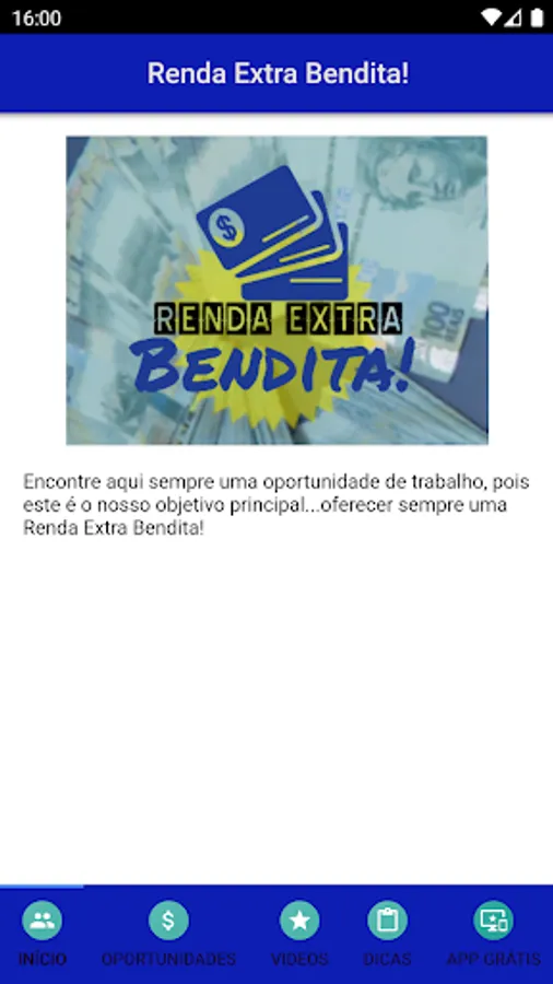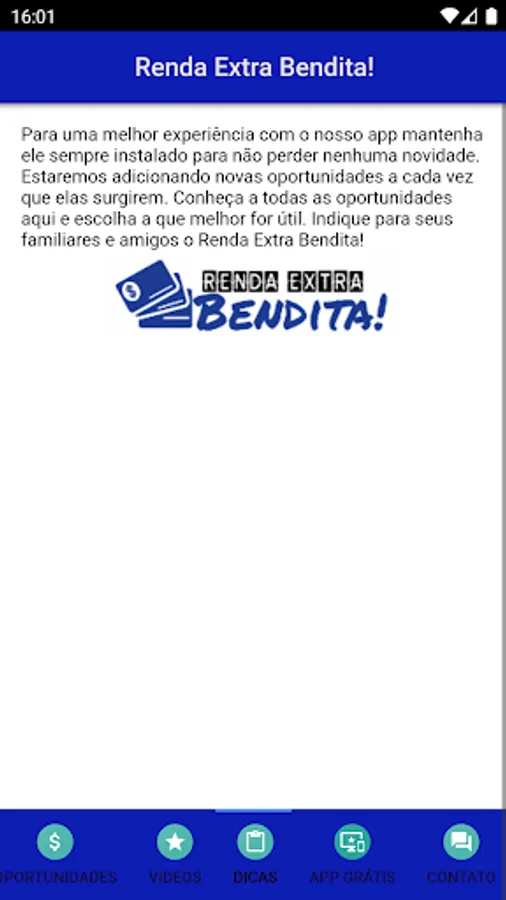 The app "Renda Extra Bendita!" is a platform for disseminating extra work opportunities over the Internet or even to do from home. In difficult times where finding a job is not very easy, we saw the opportunity and the obligation to do something useful to help our peers to obtain a job and an extra or even definitive income. That's why "Renda Extra Bendita!" exists, we want to see them all trying to earn some money! Now that you know our intentions and objectives ... download our app and browse to get to know our work more closely, suddenly the opportunity you need is at your fingertips. We cheer for you and everyone. Good luck! Note: Recommend this app to your family and friends. Keep the app installed to be notified whenever news comes up!