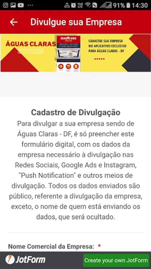 We hope to count on the support of the products and services companies, so that we can spread the word to all partners and social media, to show the local and external public, how well they will be served with great products and services companies in Águas Claras. For this you will need to send us the completed digital form. The same will be found by clicking on the icon: Advertise your company, or on the banner advertise here.