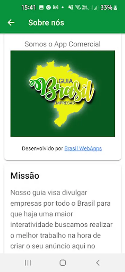 We are the Brasil Empresas Guide here you will find companies of all segments, as well as stores, services, offers, services, public utilities etc. Download the app and learn more about us. Guia Brasil Empresas has the best disclosure with the best cost benefit, contact us through the app today and be our partner. The Brasil Empresas Guide was designed for companies and also for the whole family. Advertise with us and get a personalized app for your store as a gift. Promotion valid for the first 50 companies that download our app, fill out the form and submit.