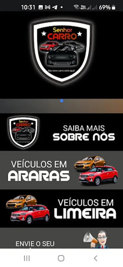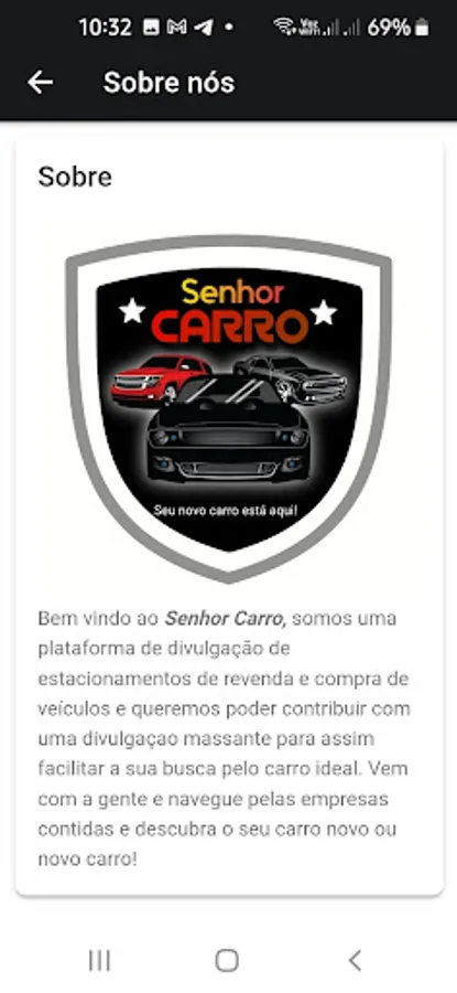 Senhor Carro is an application for publicizing stores and parking lots for buying, selling or exchanging vehicles in general. Our objective is to promote the best companies in the automotive sector for an easy search for the desired car. Before buying a new car or exchanging for another, be sure to download 'Mr. Car' and search for companies here in our app, suddenly the good deal may be closer than you think. Senhor Carro is an application made with great care and responsibility and that's why it will seek to present reputable companies so that it can always offer the possibilities of finding the best deal for everyone. Download the app and tell your friends!