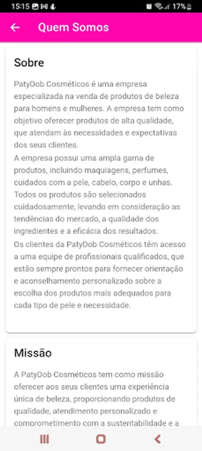 PatyDob Cosméticos is a company specialized in the sale of beauty products for men and women. The company aims to offer high quality products that meet the needs and expectations of its customers.