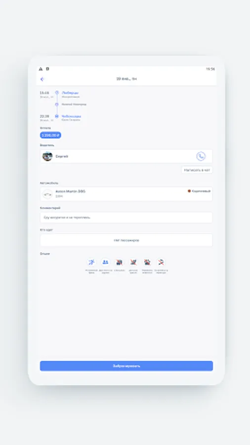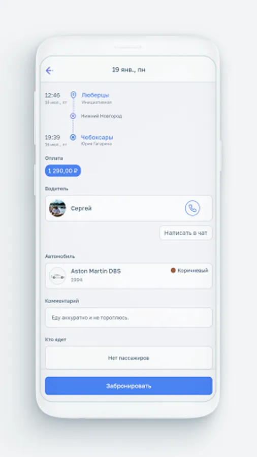 If you want to get to another city with fellow travelers, you only need to select the cities of departure and arrival and - optionally - the date. After booking, the driver receives a notification and contacts the passenger. Cash payment.