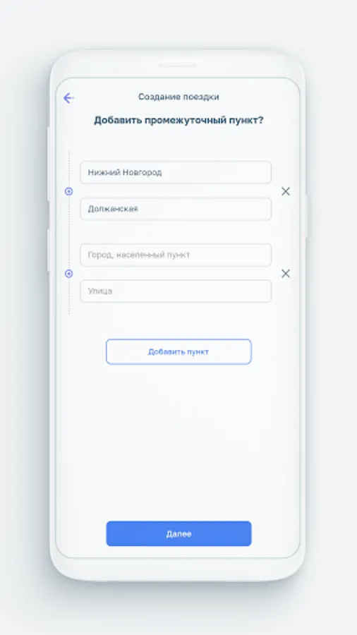 When creating a trip, the service asks you to enter the names of the cities of departure and destination (without specifying specific points, for example, train stations), after which it immediately adds several cities to the route through which the route passes.