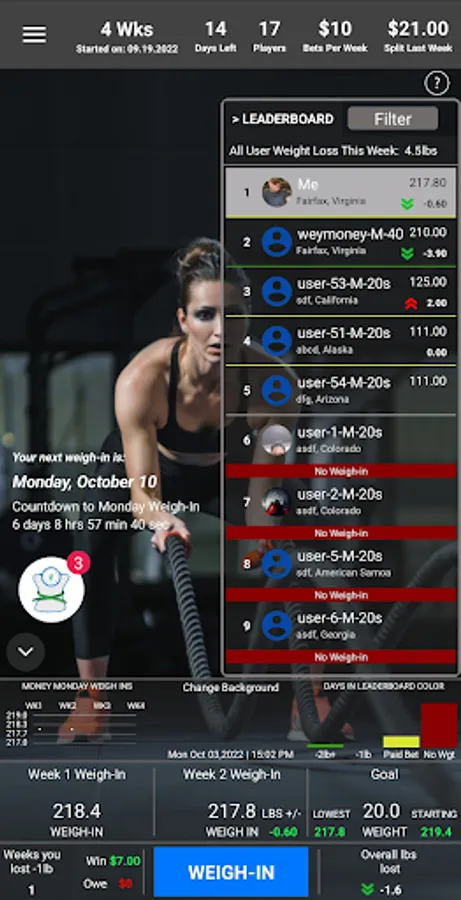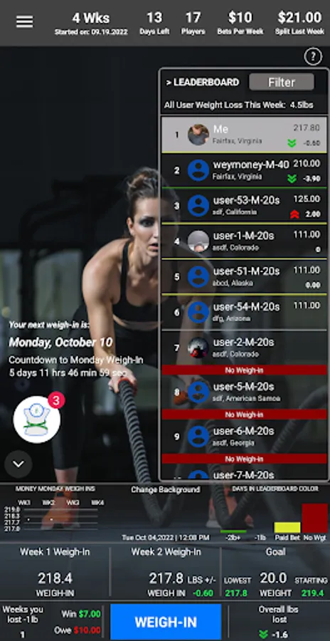 Imagine, every Monday, thousands of American weight loss competitors step onto their scales and sync their weigh-ins into a real-time weight loss leaderboard. Competitors make a weekly bet on themselves that they will lose -1lb. Competitors that gain weight or don't lose the at least -1lb from Monday to Monday pay their bet.