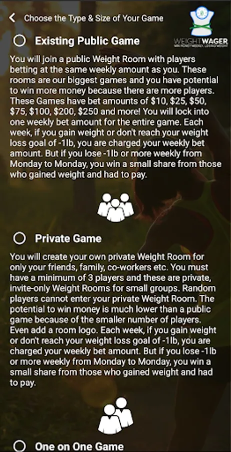 You can also create your own private Weight Wager One on One game between you and one friend or family member. Competitors that lose at least -1lb weekly, win a share of that money.