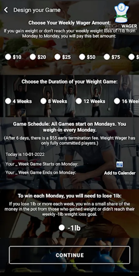 This amount will be locked in for the entire game. You weigh-in only on Mondays throughout the game. We call this 'Money Mondays'. If you gain weight or don't lose -1lb each Monday, you pay the amount above that you wagered.