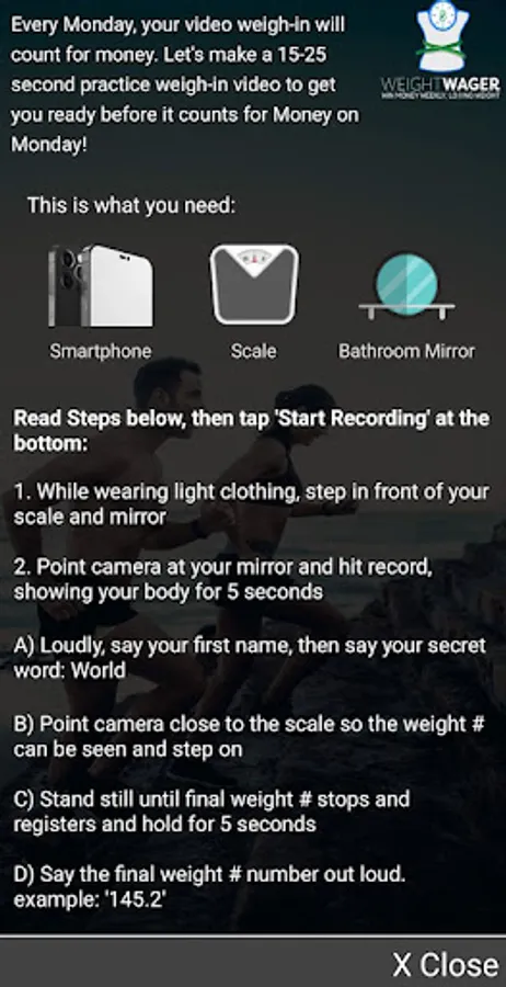 To ensure accurate weigh-ins, and the integrity of the game, every Monday, you will upload a a 15-25 second weigh-in video showing your entire body with your mirror, your scale and your latest weigh-in #.