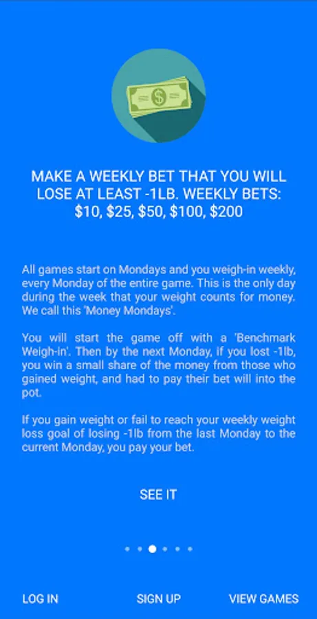 If you lose-1lb each Monday to Monday, you win a share of money with other users from those who had to pay their bet. If you don't weigh-in at all on Mondays, you pay your weekly wager amount.
