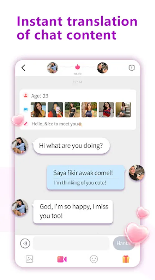 We also value the privacy and security of our users. All user information is strictly confidential, and our platform also monitors and handles any inappropriate behavior to ensure user safety. Moreover, our app also provides instant translation, allowing users from different language backgrounds to communicate Easily, breaking down language barriers and enabling global users to make new friends or find their significant other more easily.