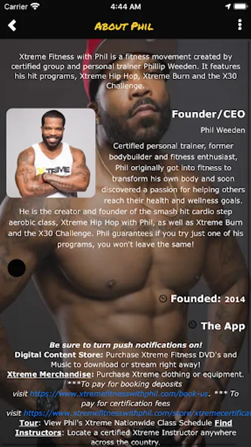 Xtreme Hip Hop with Phil is a step aerobic fitness movement created by certified group and personal trainer Phillip Weeden out of Cleveland, OH. The Xtreme App allows you to stream or download his hit programs that are sweeping the nation: Xtreme Hip Hop, Xtreme Burn and the X30 Challenge. The Xtreme App features: Digital DVD's. link to Xtreme Streaming; The Store where you can purchase merchandise, The Tour to see when Phil is coming to a city near you, locating Xtreme Certified Instructors anywhere in the world, and more!