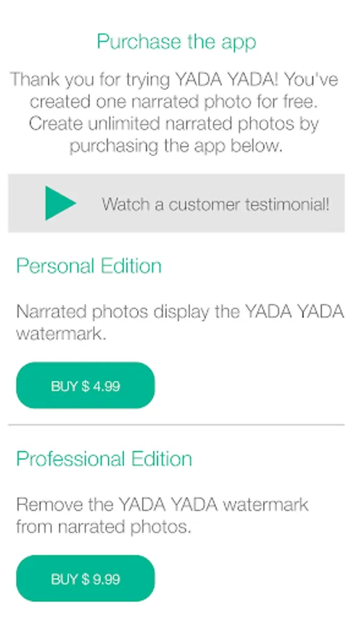 2. $9.99 for YADA YADA Professional Edition: No YADA YADA logo will appear on your narrated photos (perfect for business or professional users).