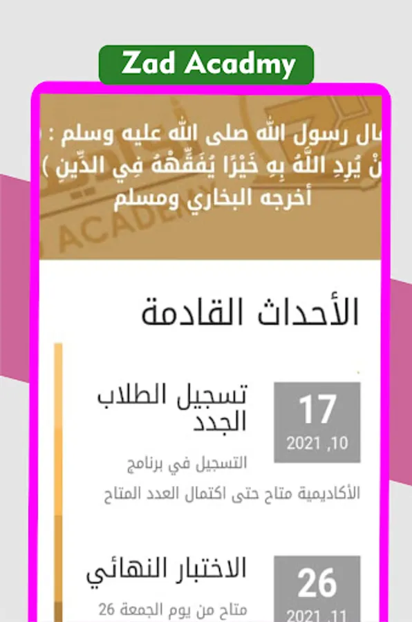 Zad Academy is a virtual academy offering an educational program designed to facilitate Islaamic knowledge, for those interested in it, via the Internet and through the ZAD TV channel.