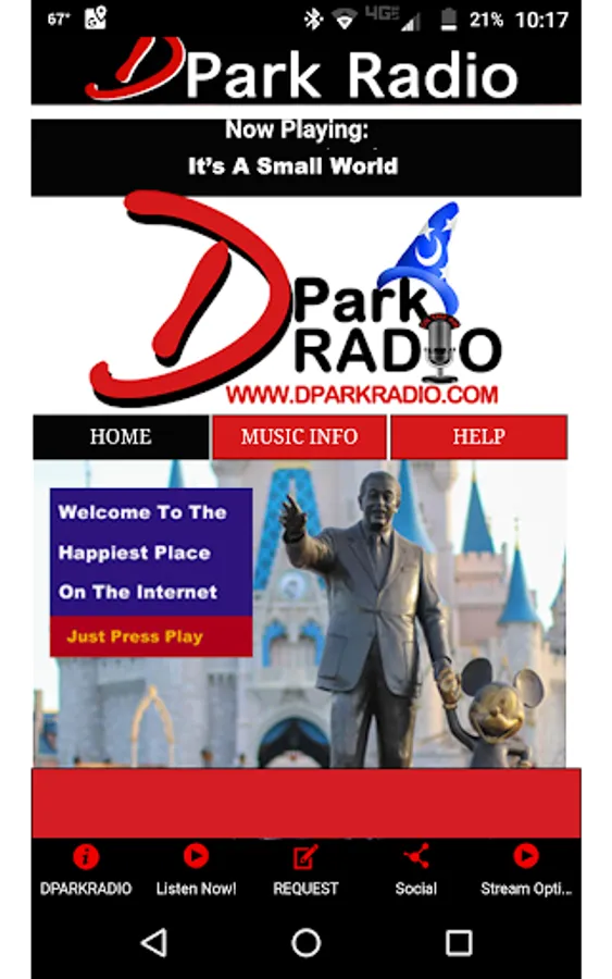 Theme Park Music From Walt Disney World and Disney Parks everywhere! Disney Music or Disney Radio to the max! Remember the first time you walked under the tunnel into the Magic Kingdom at Walt Disney World? That incredible feeling you had knowing you were really there, that this was really happening! That is what DParkRadio is all about. The Parades, The Attractions, and of course the Fireworks from Disneyland, Disney World, and more! We want to give you that feeling of being there everyday! At Work, At Home, and On The Go! No matter where you are, DPARKRADIO.COM will bring you home to the greatest theme parks on the planet! Enjoy!