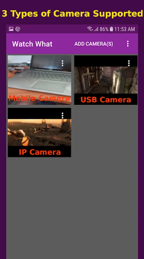 - Be usable to view cameras that can not more than 6 at the same time, i.e. 1 mobile camera + 5 IP cameras, which can be customized.