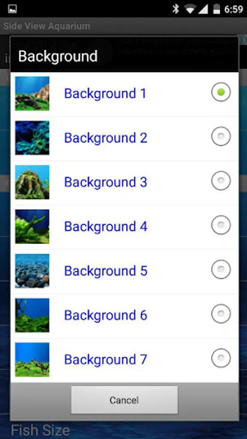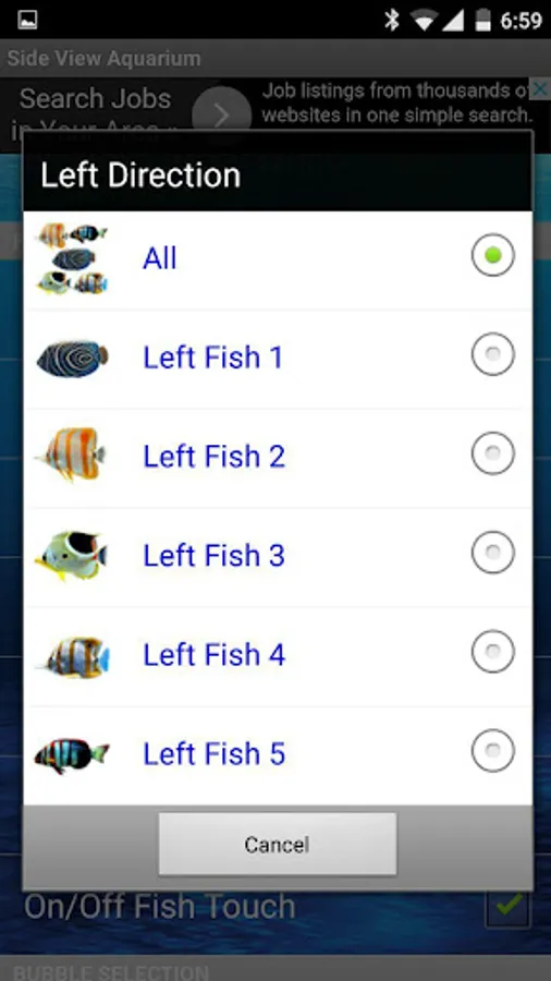 Aquarium and fishes appear in side view. Fishes can move faster if we touch on it. We can change the backgrounds and fishes, customize the fishes quantity, size and speed.