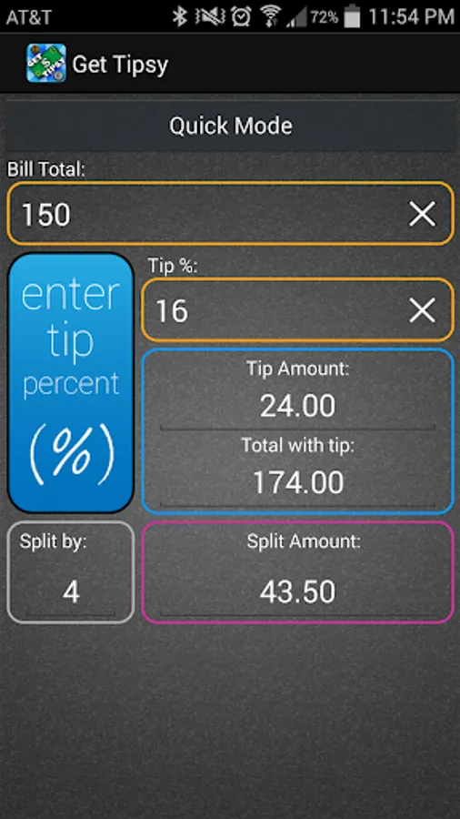 Use the Quick Mode to quickly and easily calculate the tip amount and total with tip based on the bill total. Quickly toggle through the most common tip percentages (15%, 18%, and 20%) to see how much tip to leave. If that’s not enough, you can even choose to enter your own tip amount or tip percentage. The tool will also allow you to split the total bill with tip evenly amongst others.