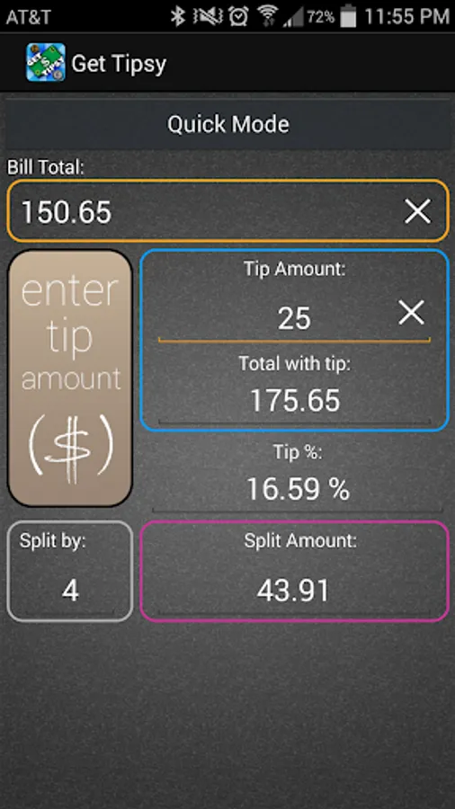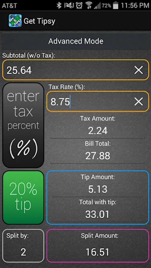 At a glance, the Get Tipsy tip calculator app is designed with multiple colored boxes that are strategically placed to provide you with the tipping information you need in a quick, easy to read, and organized fashion.