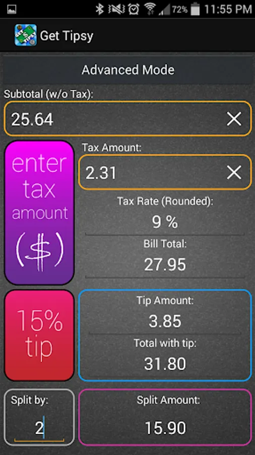 Use the Advanced Mode to calculate tip based on the pre-tax subtotal instead of the bill total. The advanced mode works similar to the quick mode but allows you to enter the pre-tax subtotal and the tax amount or tax percentage separately to help you calculate the tip based on the pre-tax subtotal.
