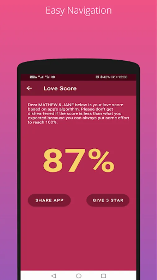 This Love Tester app works based on the names entered and runs the algorithm to calculate the love in percentage.