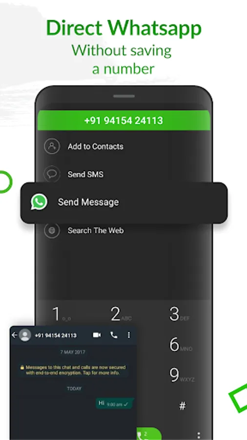 Just type the number and send a direct message, call by SIM 1 or SIM 2, or directly send a WhatsApp message or phone call app .