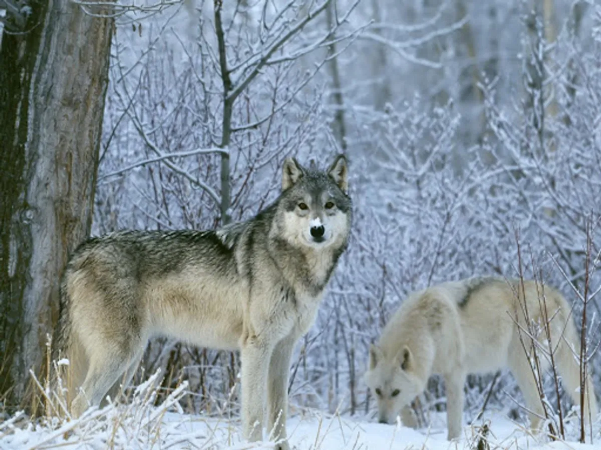 The gray wolf (Canis lupus) also known as the timber wolf or western wolf is a canid native to the wilderness and remote areas of North America, Eurasia, and northern, eastern and western Africa. It is the largest extant member of its family, with males averaging 43–45 kg and females 36–38.5 kg. Like the red wolf, it is distinguished from other Canis species by its larger size and less pointed features, particularly on the ears and muzzle. Its winter fur is long and bushy, and predominantly a mottled gray in color, although nearly pure white, red, or brown to black also occur. As of 2005, 37 subspecies of C. lupus are recognised by MSW3. The nominate subspecies is the Eurasian wolf (Canis lupus lupus), also known as the common wolf.
