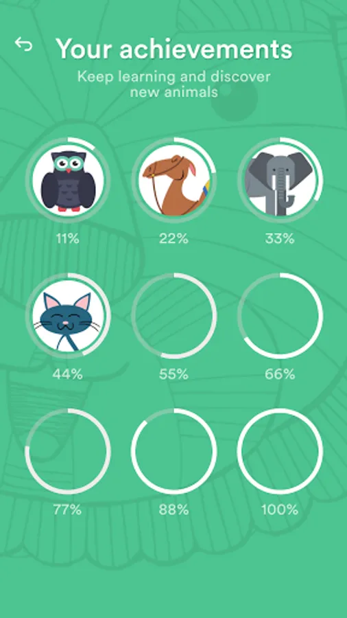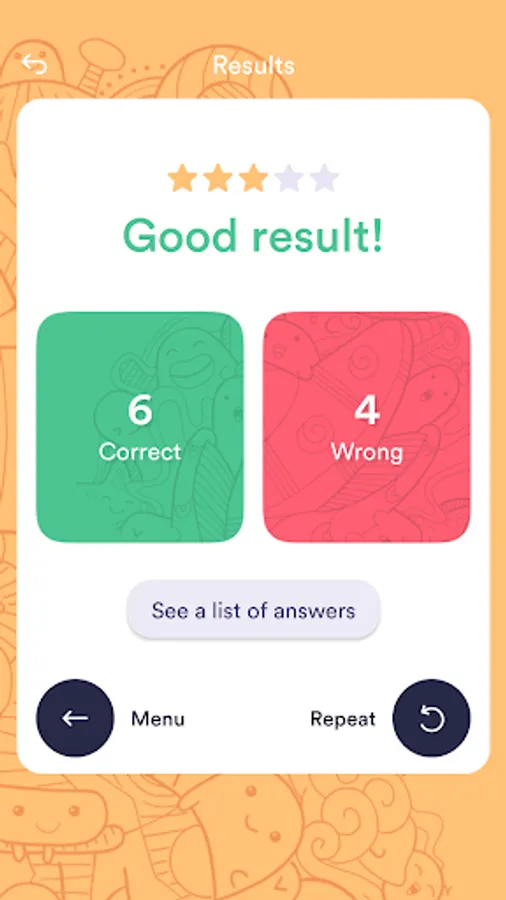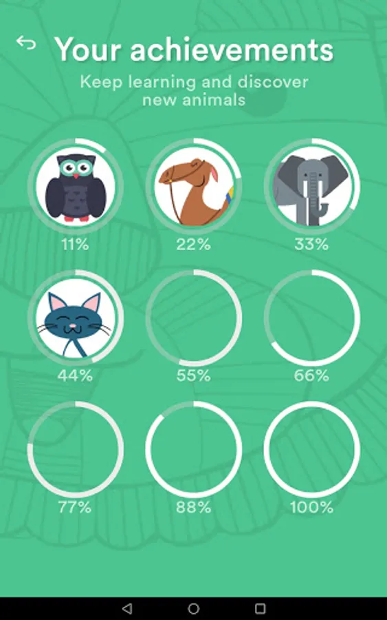 ● Numbered lessons, grading difficulty in Learning mode, repeating questions with the biggest problem, tracking progress with progress bar and stars in boards.