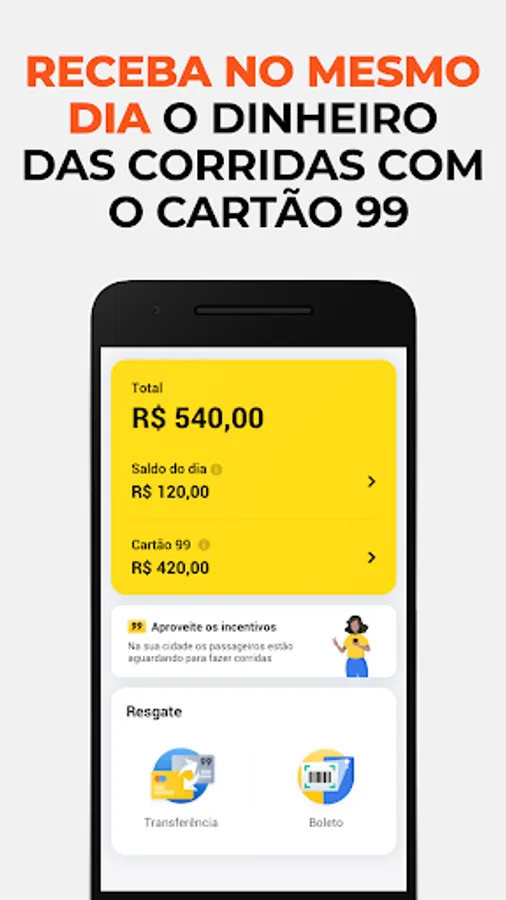 With Cartão99, partner drivers, taxi drivers and motorcyclists receive earnings from rides and deliveries on the same day, in up to 20 minutes, with no fee or annual fee.
