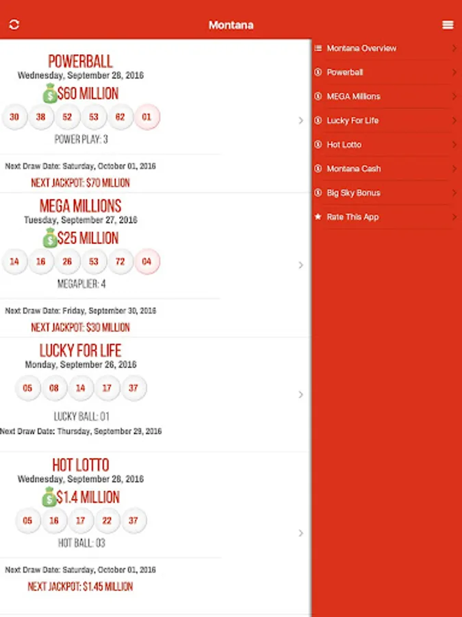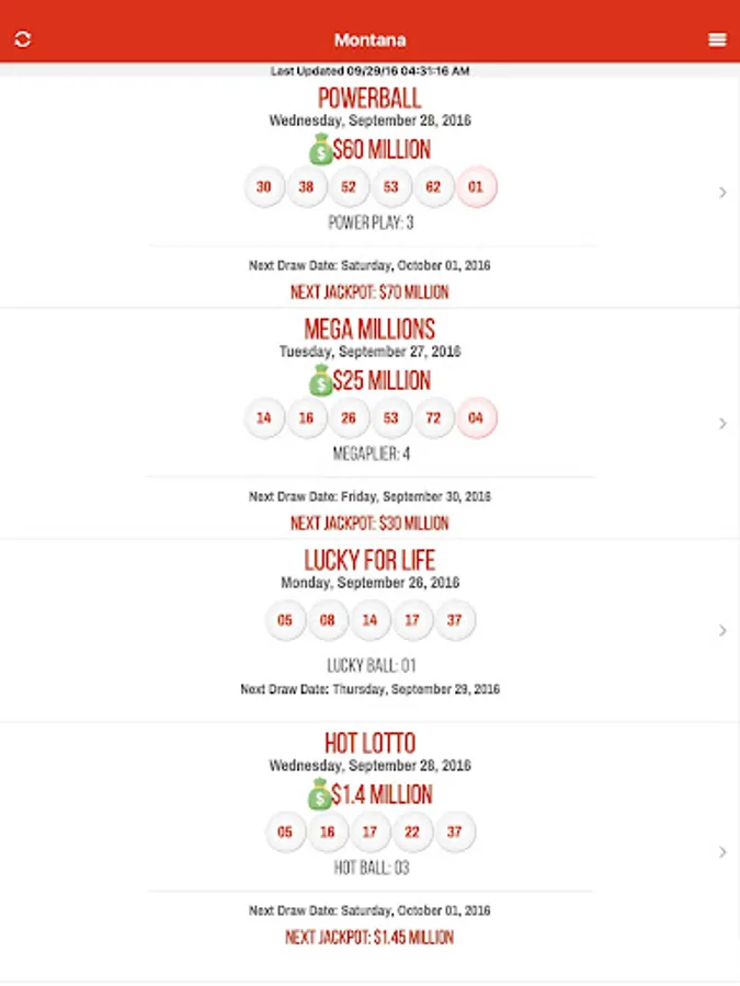Montana Lotto Results for MT Lottery Games. Easy and Fast Lottery Jackpots, Winning Numbers, Draw History, Payouts and Prize Levels for Powerball, Mega Millions and all other State Lottery Games.