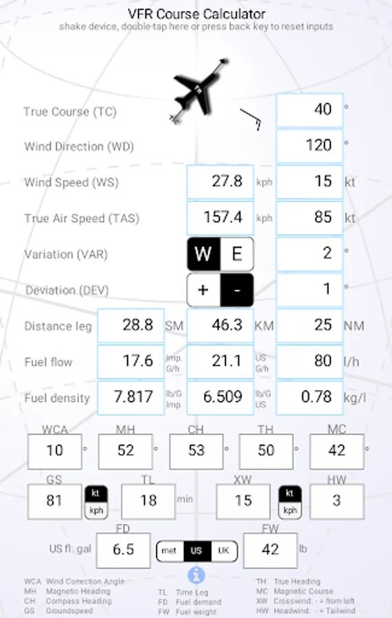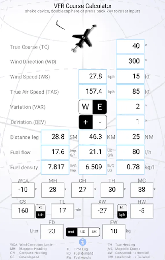 The VFR Course Caclulator calculates true heading, magnetic heading & course, compass heading & course, wind correction angle, crosswind and headwind by entering the true course, wind direction and speed, true air speed, variation and deviation. Further it is possible to calculate the flight time (TL) for a distance in dependance of groundspeed. Based on these values it calculates fuel demand and weight if you enter the consumption (flow) and fuel density. It does not matter which field you use. The app will automatically convert the entered data in metric, US and UK unit system.