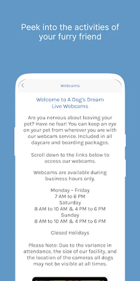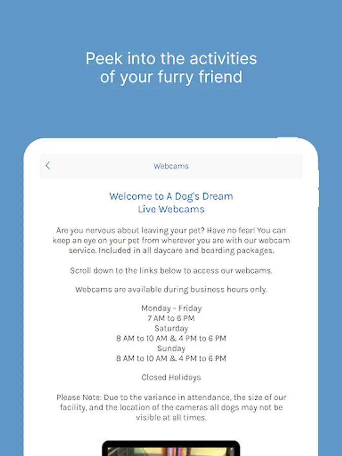 Download A Dog’s Dream mobile app and have instant access to all the informationyou need to manage your pet’s boarding, daycare, training, and grooming needs right from the convenience of your mobile device.