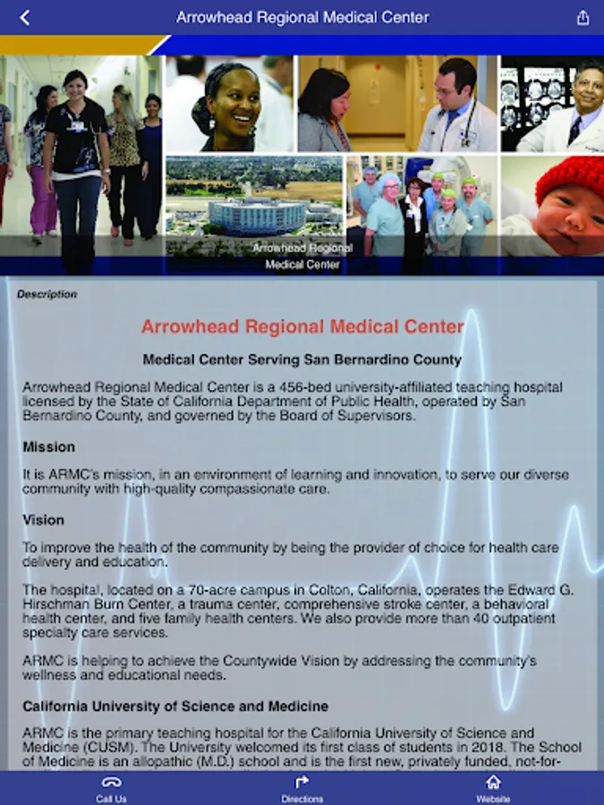 Arrowhead Regional Medical Center is a 456-bed university-affiliated teaching hospital licensed by the State of California Department of Public Health, operated by the County of San Bernardino, and governed by the Board of Supervisors. It is ARMC’s mission, in an environment of learning and innovation, to serve our diverse community with high-quality, compassionate care. The hospital, located on a 70-acre campus in Colton, California, operates the Edward G. Hirschman Burn Center, a level II trauma center, a primary stroke center, a behavioral health center, and five primary care centers. ARMC also provides more than 40 outpatient specialty care services. ARMC is helping to achieve the countywide vision by addressing the community’s wellness and educational needs.