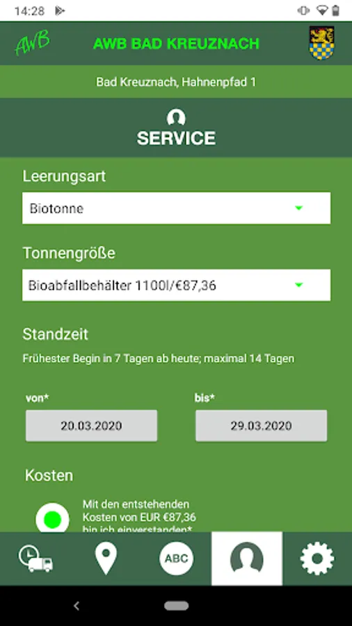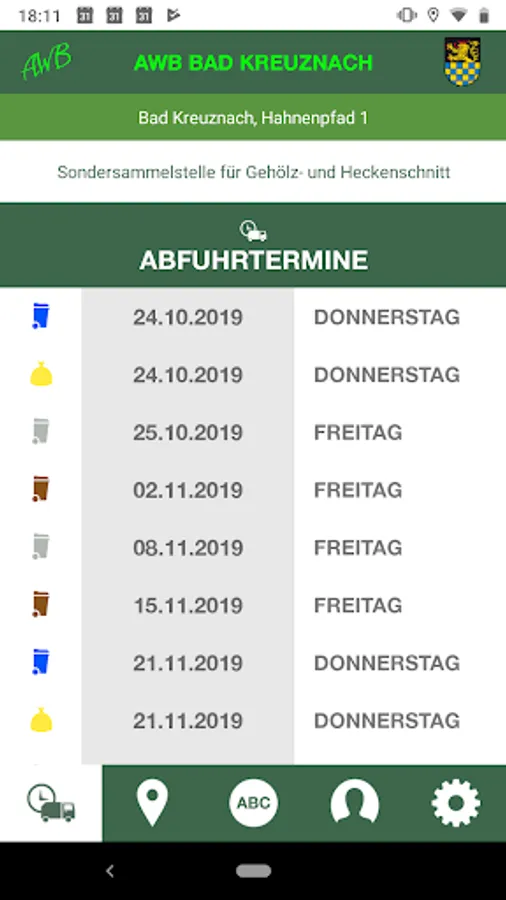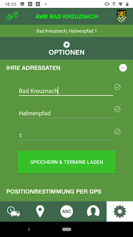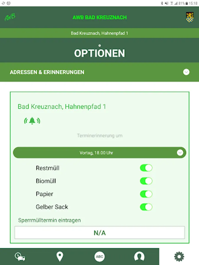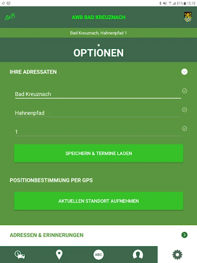 In the options, the address data is stored and the reminders of the individual garbage dates are controlled. The address data can be entered both by keyboard entry and by querying the GPS coordinates. It is possible to save several addresses. The appointment reminders can be set separately for each type of emptying: residual waste, organic waste, recycling, waste paper and pollutant collection. The reminder for your personal bulky waste appointment can also be defined here.