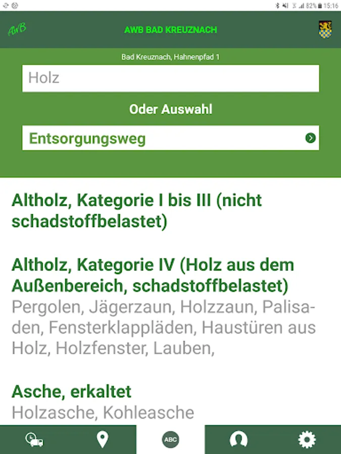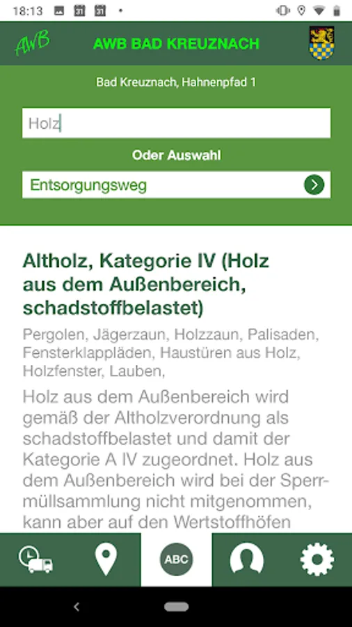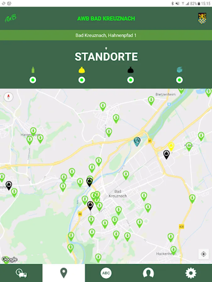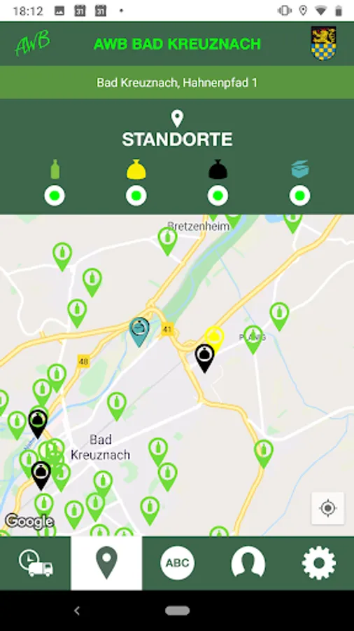 The location search helps locate recycling centers, waste glass containers, distribution points for yellow bags, or points of sale for additional waste bags. The positions of the surrounding places are displayed sorted by distance. When you tap on the respective location, this is shown on the map, including a description of the route. Detailed information such as opening times or contact options are displayed.