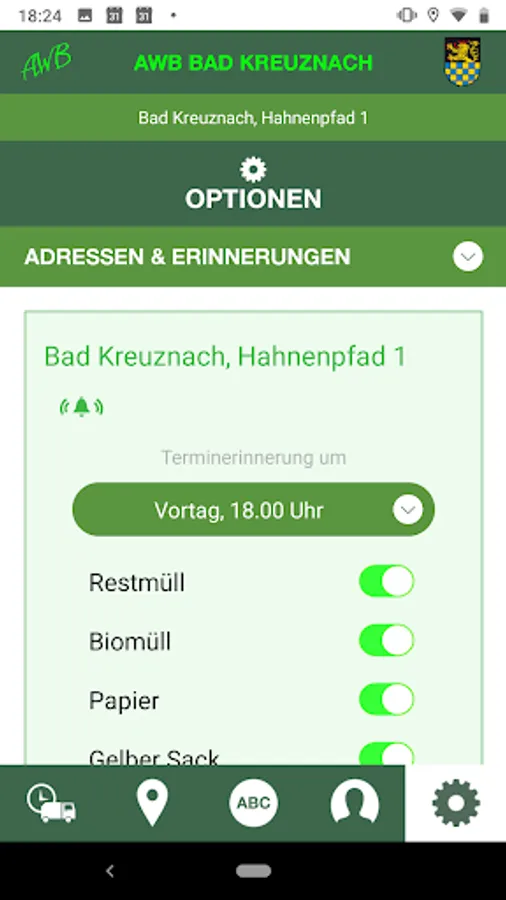 In the settings, you can specify the types of waste - residual waste, organic waste, paper or yellow bags - for which you would like a reminder.