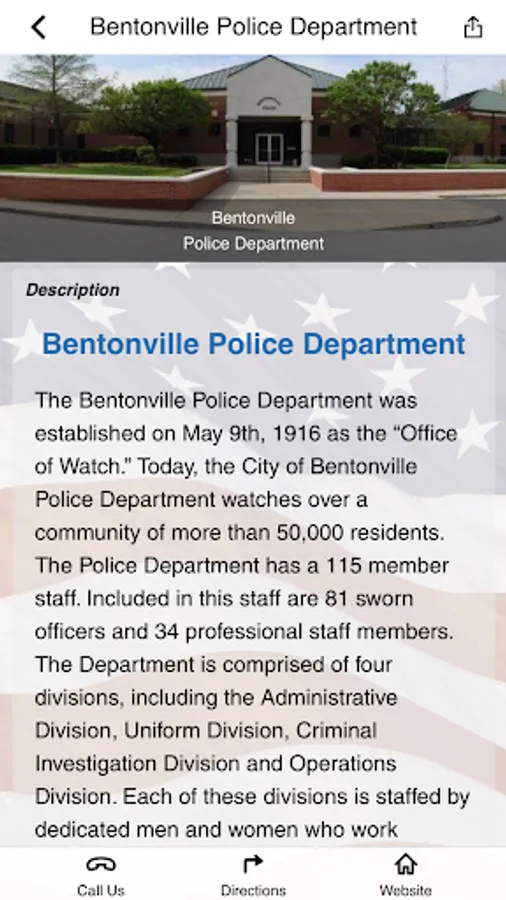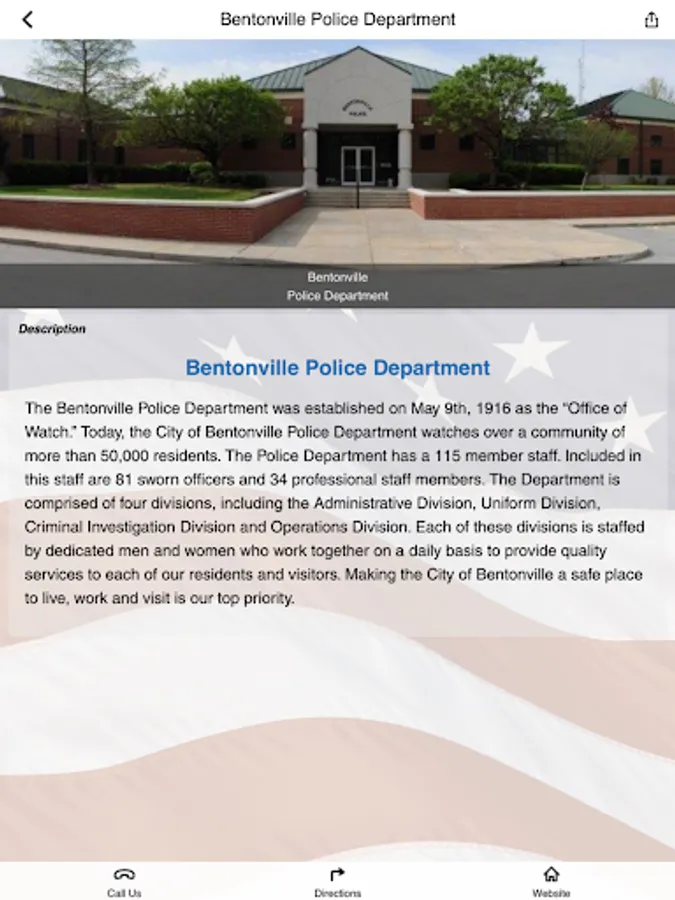On behalf of the men and women of the Bentonville Police Department, welcome to our app. This app is for the employees and family members of the Bentonville Police Department as well as the community it serves. It contains information about our department as well as safety and crime prevention tips. Bentonville Police Department employees will have access to a full range of wellness tools.