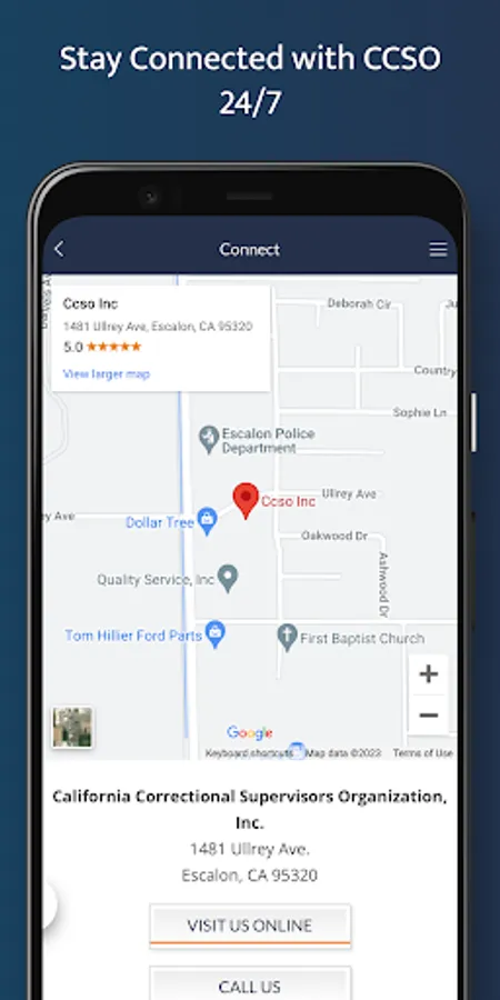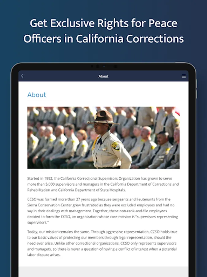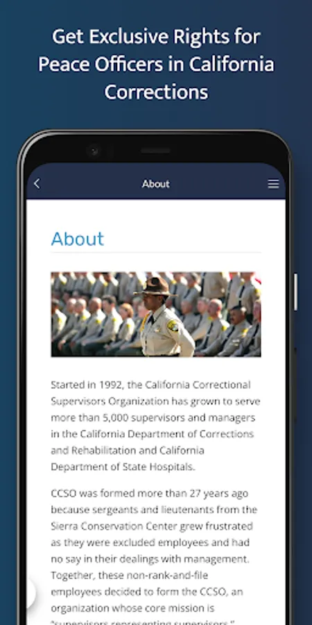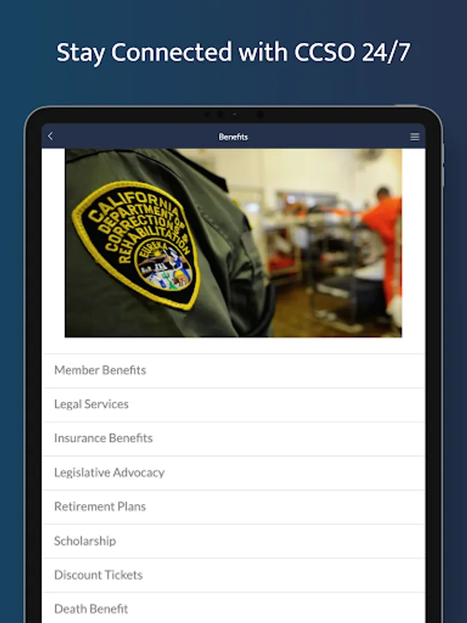 The California Correctional Supervisors Organization (CCSO) app allows members to stay connected with their organization anytime, anywhere. The app provides important information and services, including breaking news, upcoming events, access to legal assistance and insurance benefits, connections to CCSO's website, Keynotes magazine and social media, and much more!
