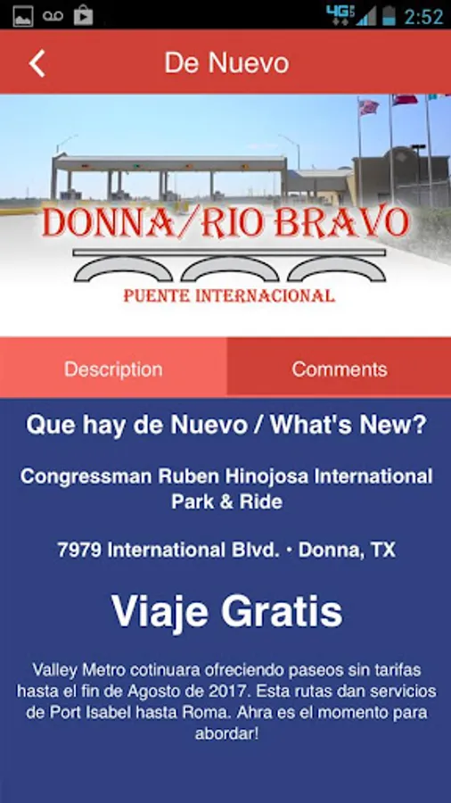 Esta aplicación muestra una transmisión en vivo del tráfico en el Puente Internacional Donna-Rio Bravo. Tambien esta disponible información de contacto, cuotas y horario.